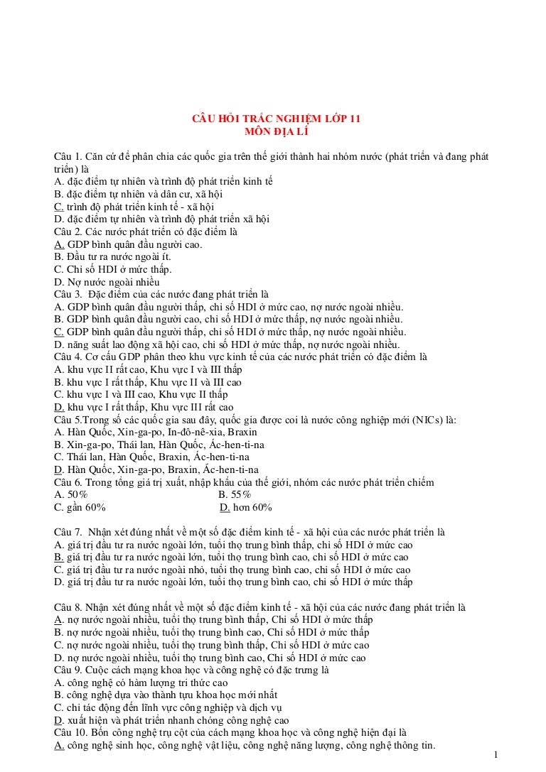 Cau Hỏi Trắc Nghiệm Lớp 11 Mon địa Li 10562212092019